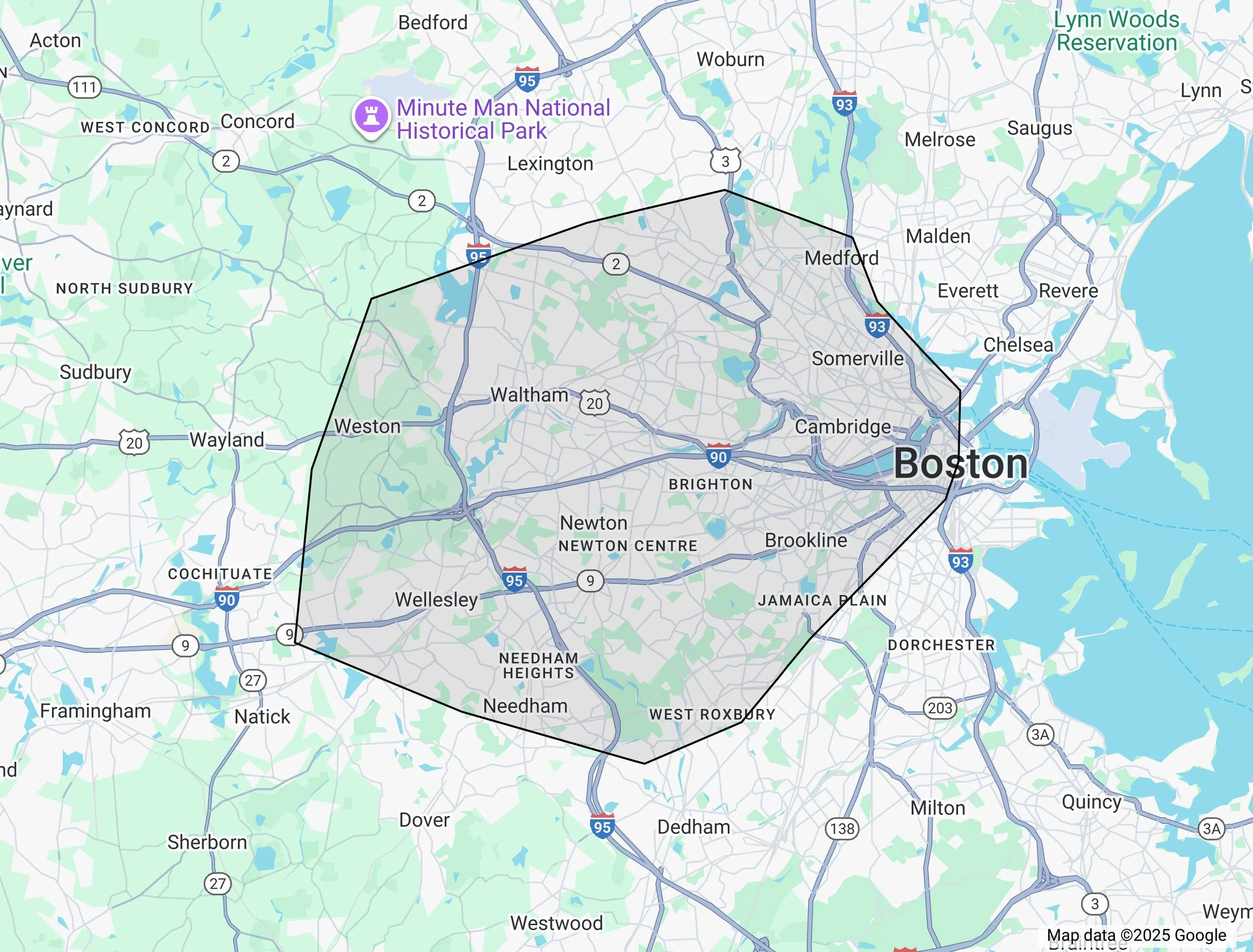 Serving parts of Boston as well as Arlington, Belmont, Brookline, Cambridge, Medford, Needham, Newton, Somerville, Watertown, Waltham, Weston, Wellesley, and some other areas of Greater Boston.